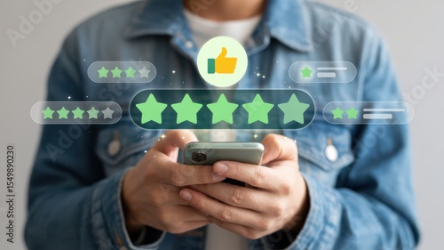 Man holding smartphone while selecting five-star rating with digital interface review. Customer satisfaction, feedback, digital reputation.