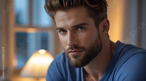 Man in a blue shirt sitting on a couch in a dimly lit room, deep in thought, capturing a moment of contemplation and introspection in a cozy and tranquil atmosphere