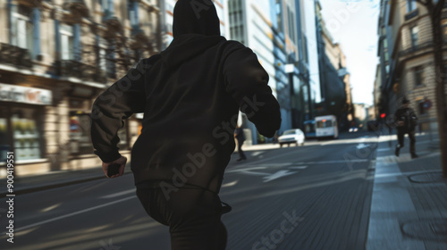 Man in a hoodie running rapidly through a city street, conveying urgency and action in an urban setting.
