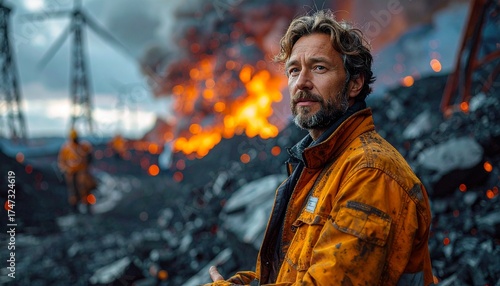 Man in an orange jacket observes a scene of industrial devastation, with burning waste and distant wind turbines, symbolizing environmental challenges and human resilience in a harsh landscape