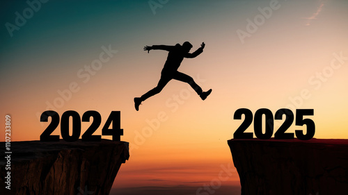 Man in mid-air, leaping from a cliff labeled '2024' to another cliff labeled '2025,' symbolizing a transition between years, progression, change, and hope for the future, set against a dynamic