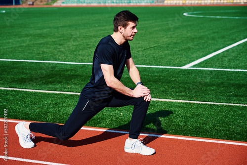 Man in sport clothers does a warm-up exercises at stadium track before jogging outdoors, Healthy lifestyle