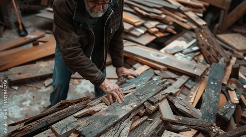 Man inspecting a pile of weathered wood planks in a dimly lit workshop environment with tools nearby