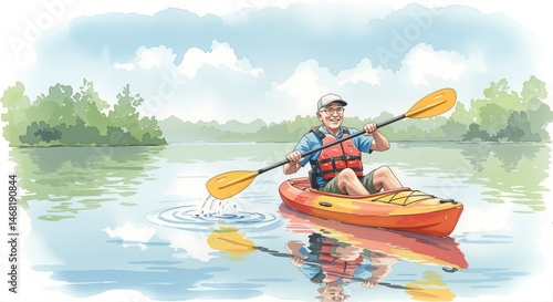 Man kayaking on a calm lake, enjoying nature and outdoor adventure