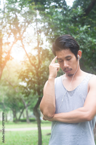 Man listening music and thinking serious