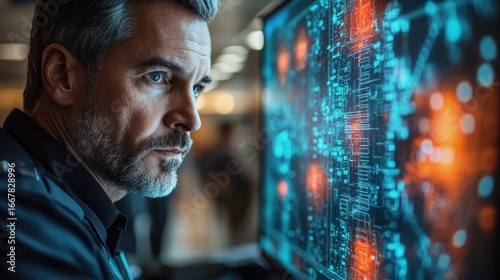 Man looking at a computer screen with a lot of data on it