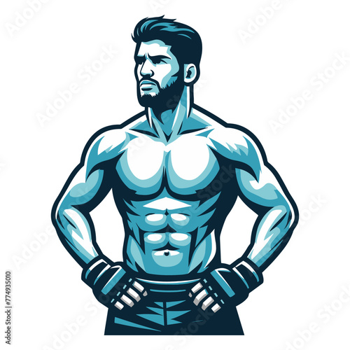 Man mixed martial arts athlete half body design illustration, MMA sport fighter, octagon combat, kicking strike, punching with fist. vector template isolated on white background