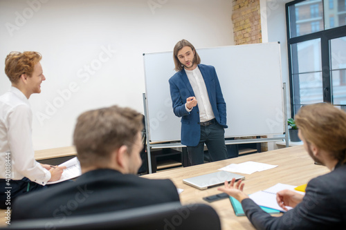 Man near stand and colleagues sitting opposite