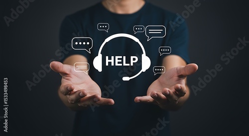 Man offering help and support with customer service headset and chat bubbles