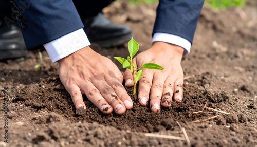 Man plants a tree seedling in soil. Showing hands in a suit planting a new sapling