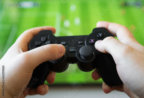 Man playing soccer video game on TV. Gamepad controller in hands.