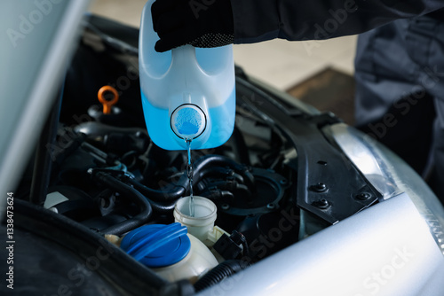 Man pouring windshield washer from plastic canister into car reservoir, closeup