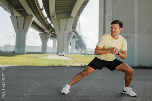 Man practicing athletic drills under a bridge in a city
