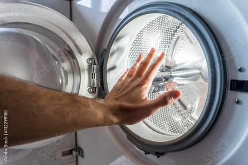 Man reaching into the illuminated drum of a washing machine. Symbol of time travel to the future.