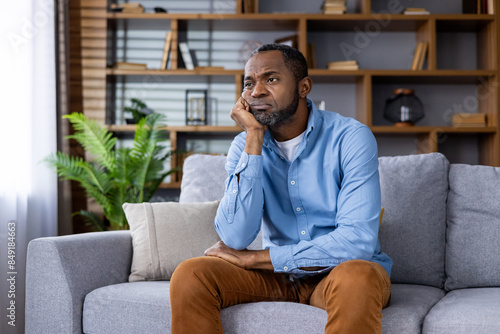 Man relaxing at home, sitting on a couch with a thoughtful and pensive expression, surrounded by bookshelves and plants