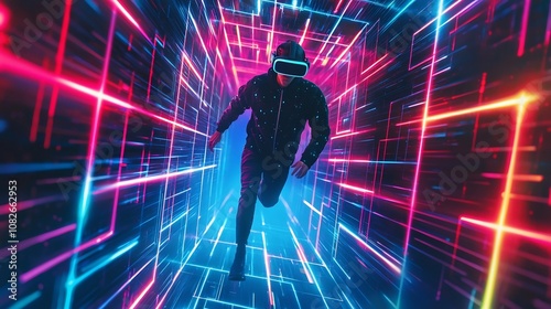 Man Running Through Vibrant Shifting Digital Maze While Wearing VR Glasses