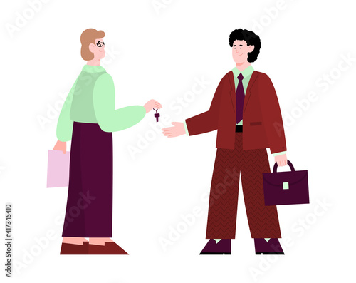 Man seller or manager hands over the keys to client or buyer, cartoon vector illustration isolated on white background. Concept of sale conclusion and purchasing deal.