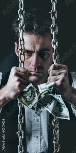 Man shackled by handcuffs made of banknotes, representing financial constraints.