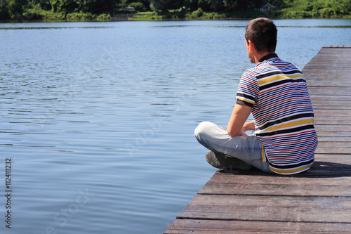 Man sitting on old wooden dock and looking at lake horizon. Thinking, contemplation, depression, loneliness concept