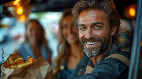 Man Smiling With French Fries in a Food Truck