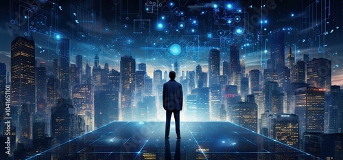 Man standing on glowing platform, cityscape behind.