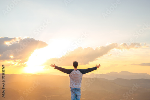 Man standing with open arms at sunset, expressing gratitude, happiness, and success while enjoying a peaceful mountain view. Concept of freedom, mindfulness, and appreciation for life.