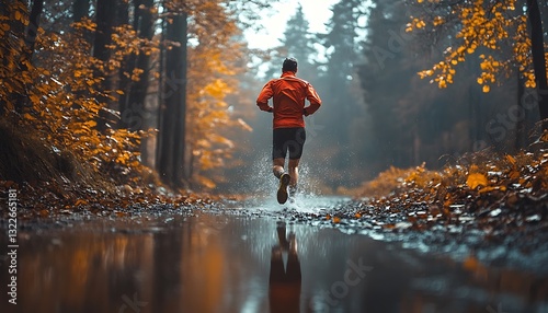 Man trail running, autumn forest, puddle reflection