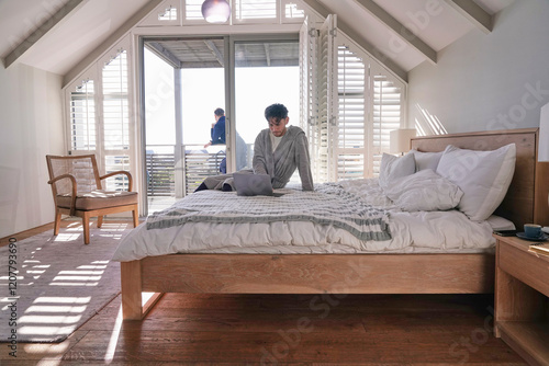 Man using laptop on bed