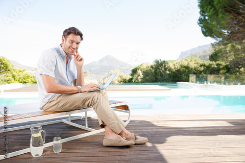 Man using laptop on lounge chair at poolside