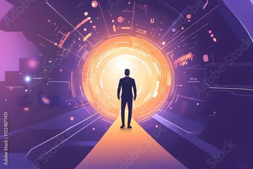 Man Walking Toward Glowing Portal Abstract Technology Future Concept
