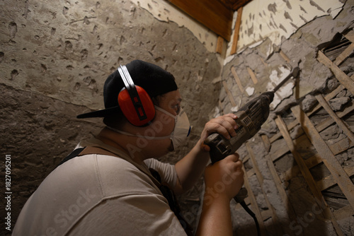 Man wearing protective gear and using a hammer drill, meticulously removing layers of plaster and cement from an interior wall during a major home renovation project.