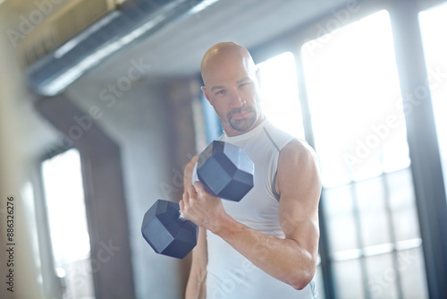 Man, weight lifting and portrait in gym for fitness with dumbbell, workout challenge and strong muscle. Bodybuilder, pro athlete and strength training for bodybuilding exercise and power competition
