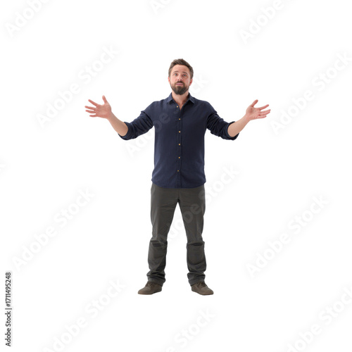 Man with arms outstretched in confusion or uncertainty