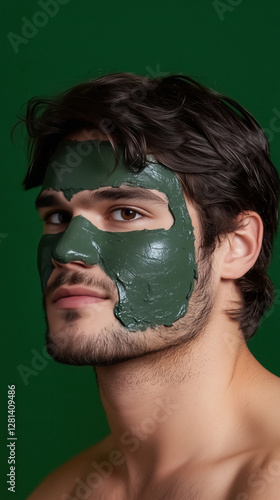 Man with dark hair and stubble wears dark green facial mask against matching green background