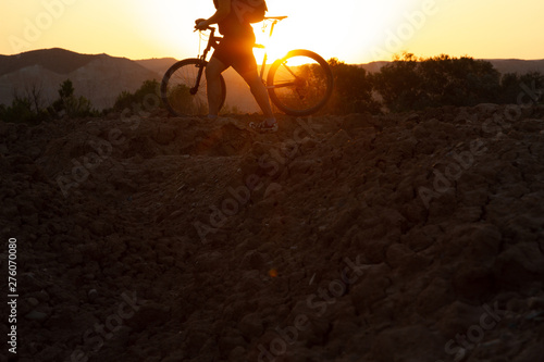 Man with mountain bike at sunrise