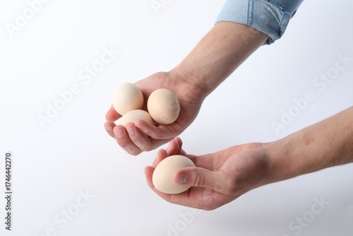 Man with raw chicken eggs on white background, closeup