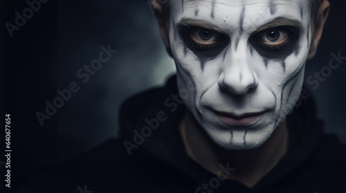 man with spooky white ghost halloween black and white makeup isolated on dark background with text copy space