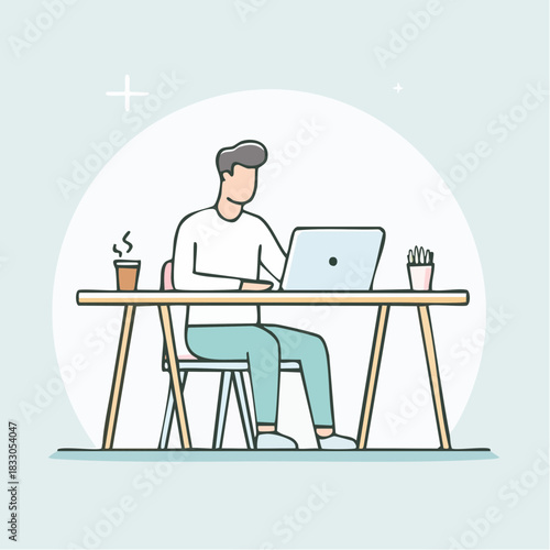 Man Working on Laptop at Desk with Coffee and Plant on Light Blue Background