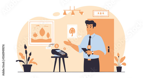 Manager Promotes Bitcoin Payment Method in Modern Art Gallery for Digital Currencies