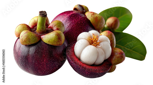 Mangosteen, Exotic Fruit: Capture the essence of the exotic mangosteen, showcasing its vibrant purple exterior and the pristine white segments inside, a symbol of tropical allure.