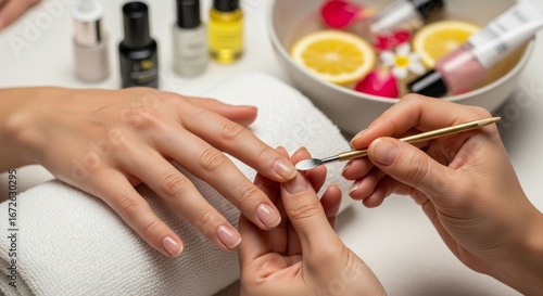 manicurist carefully applies nail polish to client's hands during spa salon treatment. elegant setting includes nail polishes, rose petals, warm candles
