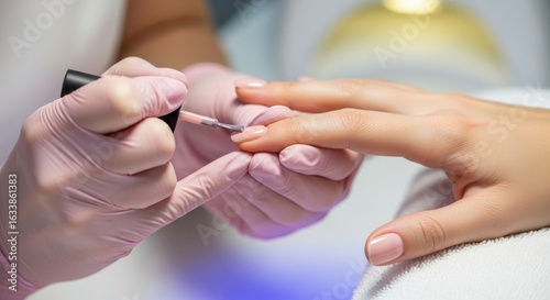 Manicurist in pink gloves applying nude nail polish during a professional manicure