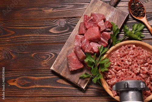 Manual meat grinder with beef, peppercorns and parsley on wooden table, above view. Space for text