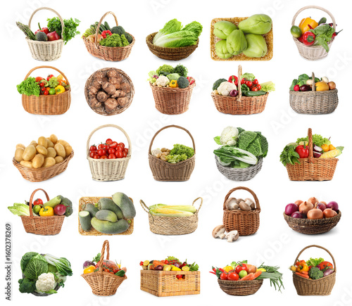 Many different fresh vegetables in wicker baskets isolated on white, set