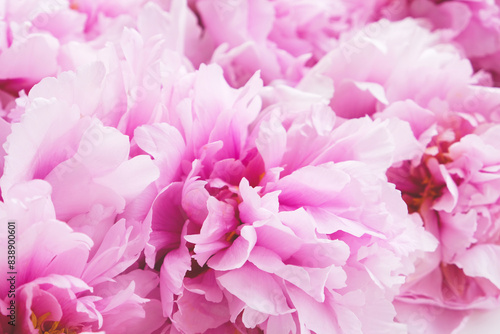 Many fresh beautiful pastel pink peony flowers in full bloom, close up. Vibrant Flowery summer texture for background.