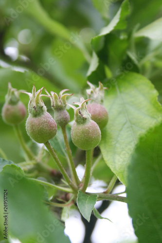 Many little green apples growing on branch in springtime. Apple tree in the orchard. Malus domestica