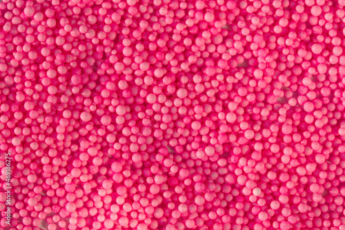 Many pink little balls for children playground. Cosmetics powder. Candy sprinkles. Top view. Trendy absract background or backplate for your design