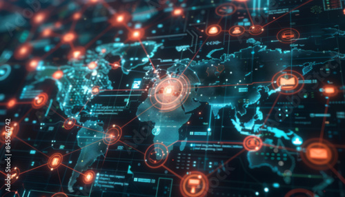 map of the world overlaid with a network of glowing lines and nodes representing digital connections. In the background, there are elements like cloud computing icons, data centers