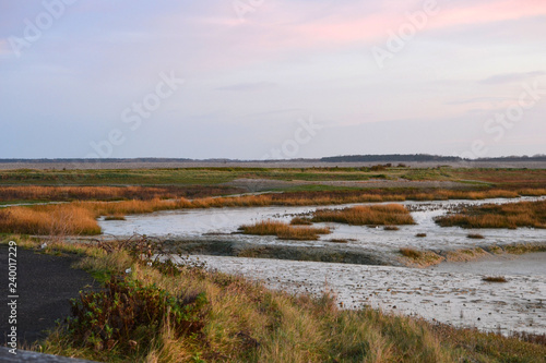 marais salant de la baie de Somme, vue du phare du Hourdel dans le nord de la France, herbes jaunes dorées dans le marais, Picardie
