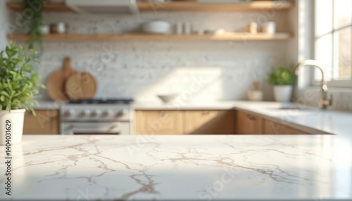 Marble countertop in modern kitchen. Blurred white interior, blank space for product display. Kitchen design with light, focus on counter surface for food, drink, decor presentation. Empty table